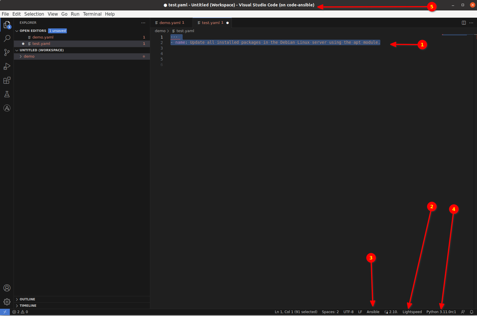 Go ahead and create a new project directory and workspace in VSCode. I made a new Ansible playbook named test.yaml as follows. Ensure you set the correct path to Python 3.11, Ansible-lint, and file type to Ansible. Otherwise, it won’t work, and it won’t give any error. When everything is set correctly, you will see the status bar as follows, and that is the only way to know if you are connected to a generative AI service: